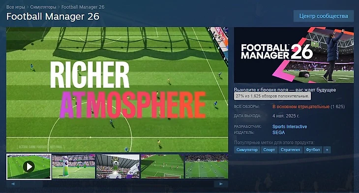 Спустя несколько часов после релиза FM 26 получил «в основном отрицательные» отзывы в Steam – лишь 27% из 1,6 тысячи обзоров являются положительными.