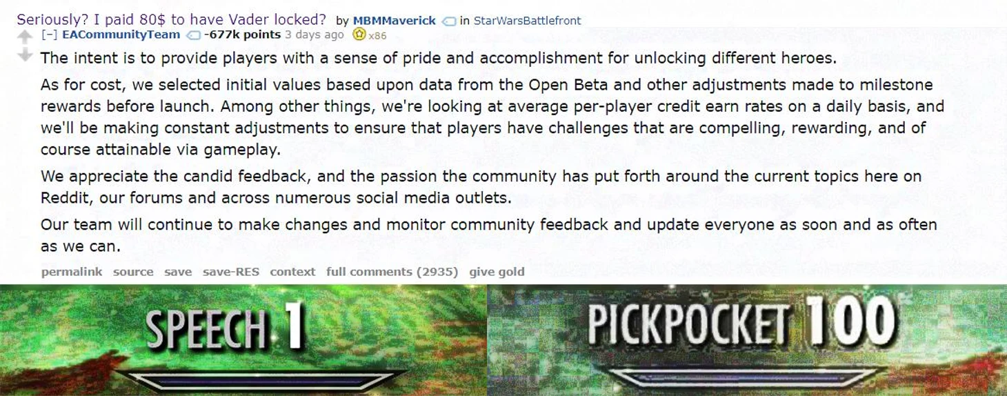 Компания Electronic Arts никогда не стеснялась лупить деньги с поклонников видеоигр. Но в случае с новой Star Wars Battlefront II они перегнули палку. При первом знакомстве с игрой выяснилось, что чтобы открыть новых персонажей бесплатно, нужно пережить какое-то фантастическое количество часов гринда (добычи валюты). Но те, кто готов заплатить сверх самой игры, могут получить Люка Скайуокера или Дарта Вейдера сразу и добыть игровое преимущество. Такой подход не особо парит в условно-бесплатных играх, но от проекта стоимостью от 60 баксов поклонники такой подлости не ждали. Правосудие фанатов оказалось страшным. Реддит буквально запылал обвинениями в адрес издателя игры, а на Metacritic пользовательский рейтинг проекта упал ниже единицы. Выносите, как говорится. Покупать игру после такого решатся немногие.Один из пользователей задал справедливый вопрос: «Серьезно? Я заплатил 80 баксов и не могу сыграть за Вейдера?» Ему ответил коммьюнити-менеджер EA, но лучше бы он не отвечал. Отмазка в стиле «мы хотели, чтобы игроки чувствовали гордость за каждого заработанного героя» не прокатила. Ответ стал самым заминусованным постом в истории ресурса (а ведь там даже выходки Трампа постят)!Убеждение – 1, Карманная кража – 100.EA не ждала такой катастрофической реакции сообщества. Компания опубликовала заявление, в котором заверила, что пересмотрит баланс и уберет из игры лутбоксы. Временно....в общем, петиция с призывом не покупать Battlefront II за 14 часов собрала 215 тысяч плюсов.А вы купите Star Wars Battlefront II?Весь игровой контент Star Wars Battefront II обойдется в 2100 долларов. Это всего лишь 124 тысячи в рублях.