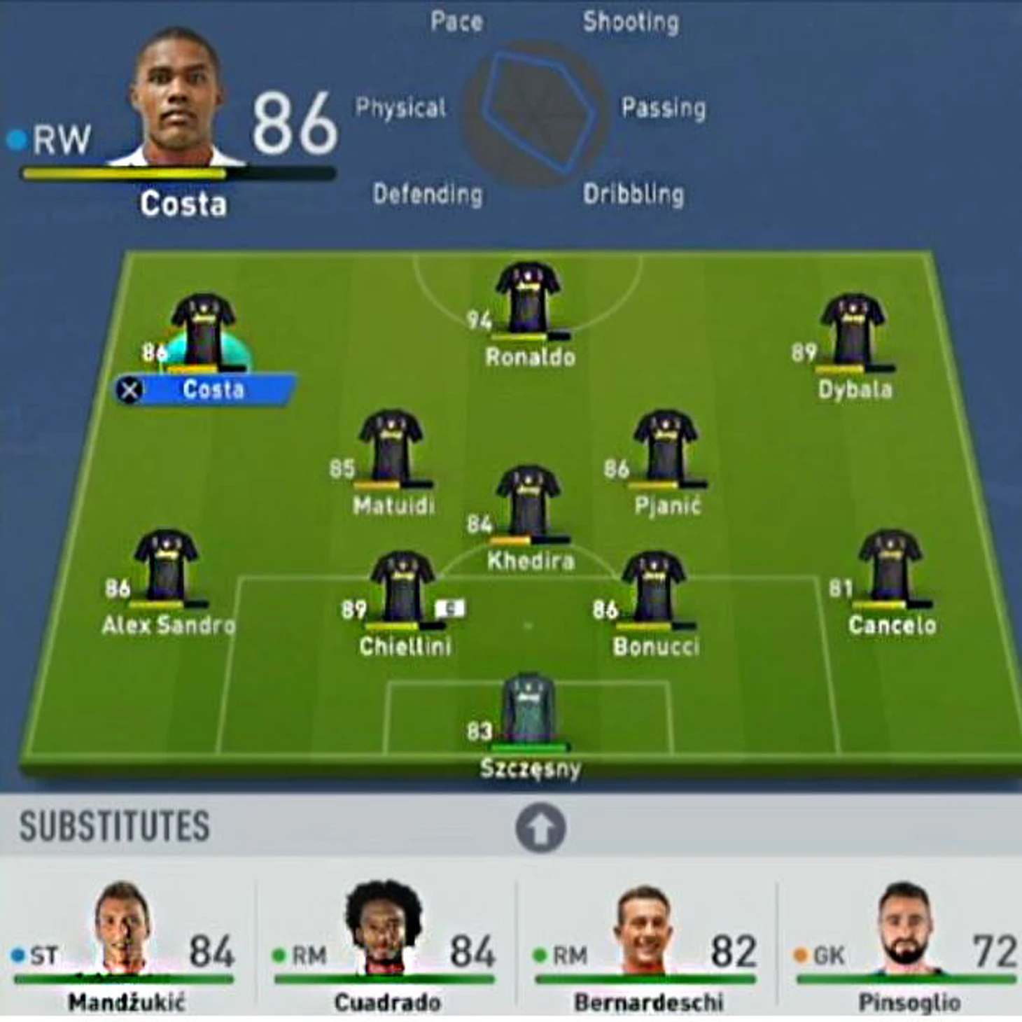 У самого Криша – все те же 94. Голевые передачи ему будут отдавать Дуглас Коста и Пьянич с рейтингом 86 и Дибала, у которого 89. Остальные линии «Юве» тоже смотрятся неплохо, за исключением вратаря – у Шченсного всего 83. При этом «Юве» может легко перестроить схему и усилить свою атаку с помощью Куадрадо и Манджукича – у каждого из резервистов по 84.