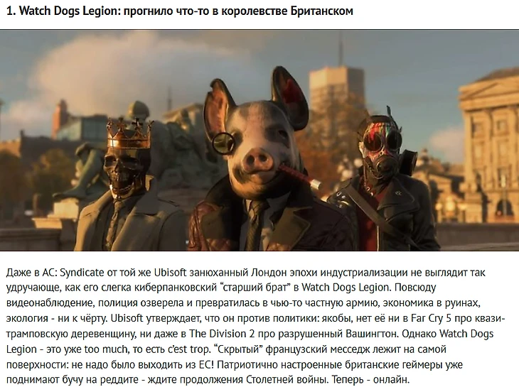 В анонсе Watch Dogs Legion журналист увидел «скрытый французский месседж». То, что канадское подразделение Ubisoft начало разрабатывать игру до Brexit, автор, видимо, не знает.