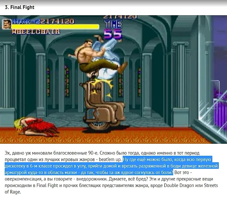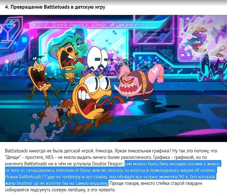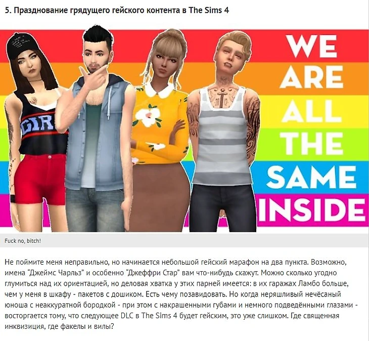 «[...] Теперь накатила уже третья волна феминизма, и это не просто волна, а самое настоящее цунами. Посудите сами: активистки оборзели настолько, что их уже не смущает очевидное противоречие двух главных постулатов: «Все мужчины – мусор» и «Женщина равна мужчине». Нормальные геймеры – один из последних бастионов, способных остановить этот безумный потоп».
