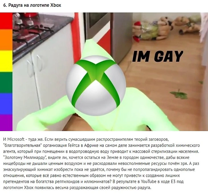 Поддержку меньшинств от Microsoft, которую большинство зрителей Е3 даже не заметили, редактор связал с попыткой единолично владеть «богатствами рептилоидами и иллюминатов».