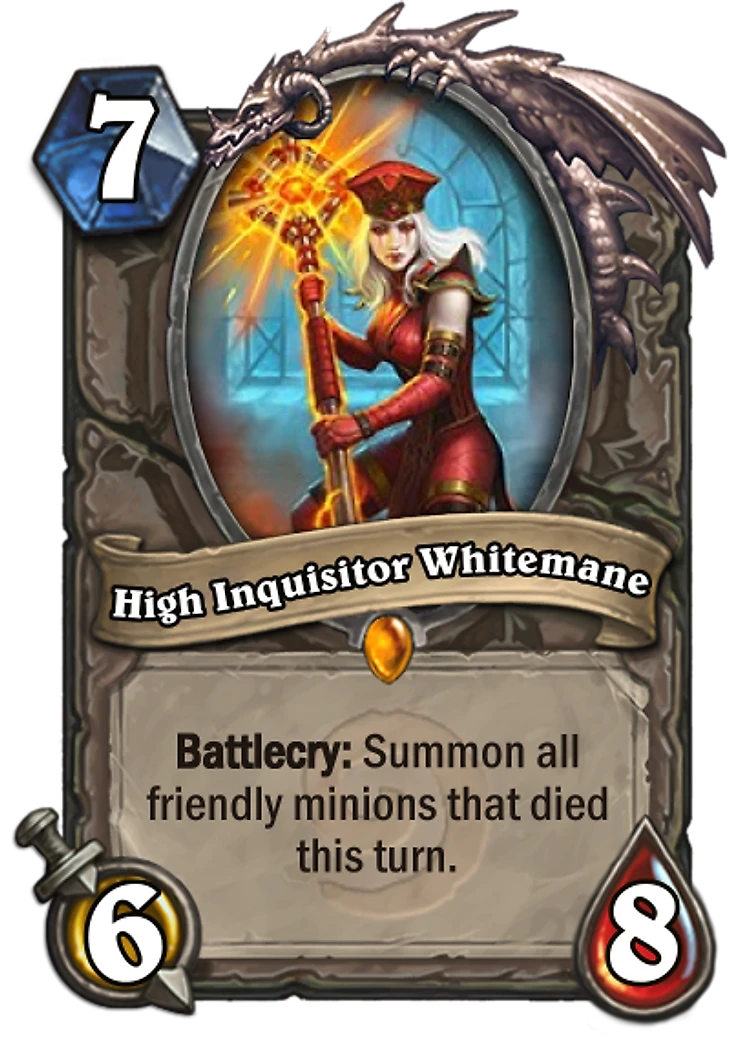 Недавно в Hearthstone добавили еще одного персонажа из вселенной WoW, Верховного инквизитора Вайтмейн. Это легендарка с Боевым кличом, которая призывает всех ваших существ, умерших на этом ходу.