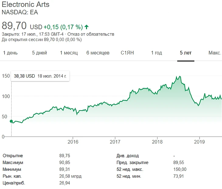 Самое большое падение стоимости акций EA было зафиксировано во второй половине 2018 года – почти на 40% (со 126 долларов до 76). Аналитики связывали это с неудачным запуском шутера Battlefield V. Релиз игры отложили на месяц, но в итоговой версии отсутствовала последняя миссия одиночной кампании, а часть контента разработчики обещали добавить в течение года.