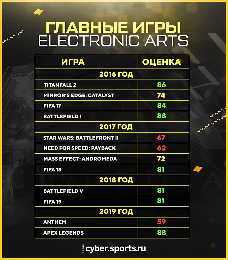 Последнее крупное падение акций EA зафиксировали в начале 2019 года. В квартальном отчете компания заявила о слабых финансовых результатах и признала провал своих основных игр (Battlefield V и FIFA 19). На этом фоне за один день их стоимость компании обрушилась почти на 14%.