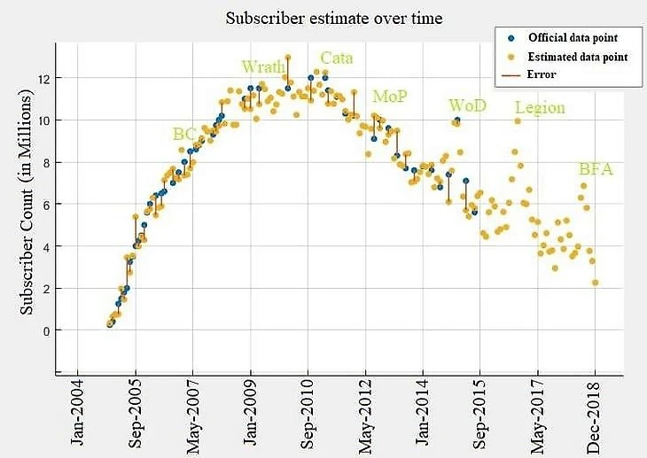 Пользователь реддита Arkey_ сделал график приблизительного числа подписчиков WoW на основе трендов Google и машинного обучения. Пик пришелся на дополнения Wrath of the Lich King и Cataclysm