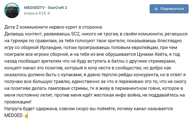 Один из самых известных российских игроков Алексей «Strange» Соляков гневно высказался на тему присутствия Медоеда сборной. Оно и понятно – Strange вполне мог занять место стримера в команде: «Хрен с ними со зрителями, кто там голосует, если даже игроки к этому серьезно не относятся... MEDOED, пошел в жопу! Куда ты лезешь? Иди играй со зрителями, рассказывай, какой ты топ-игрок людям, которые нихера в StarCraft II не понимают».