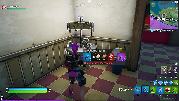 А вот следующее нововведение куда интереснее. В некоторых укромных уголках карты появились станки, на которых можно прокачать оружие, если собрать достаточное количество ресурсов. Мне удалось найти один такой во время матча, а удачно подвернувшийся противник подарил мне достаточно ресурсов, чтобы я смог прокачать свой синий автомат в фиолетовый.