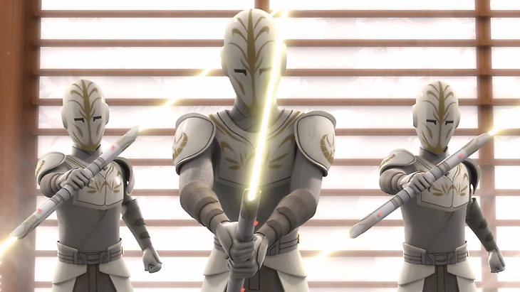Подобным оружием также пользовались стражники Храма джедаев. Отличие лишь в том, что они использовали кристаллы желтого цвета, а конструкция позволяла создавать сразу два луча. Трудные в обращении копья требовали от владельца невероятного уровня мастерства и десятки часов изнурительных тренировок.