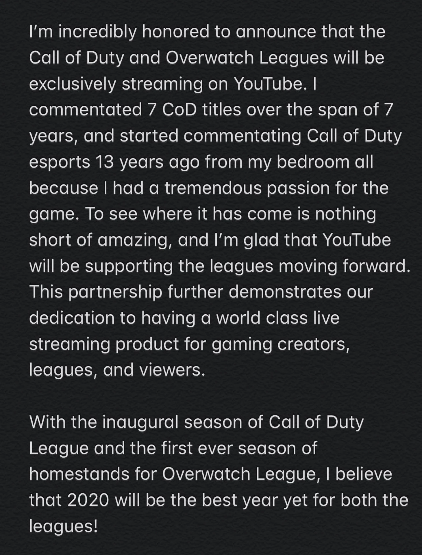 Точно известно, что новый сезон Overwatch League, Call of Duty League и соревнования по Hearthstone покажут на YouTube. То есть все главные франшизы Activision Blizzard. Также в пресс-релизе шла речь об использовании Google Cloud, но в каком качестве не сообщается. Возможно, это намёк на выпуск основных игр Activision Blizzard на многострадальной Google Stadia.
