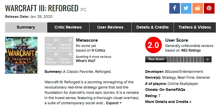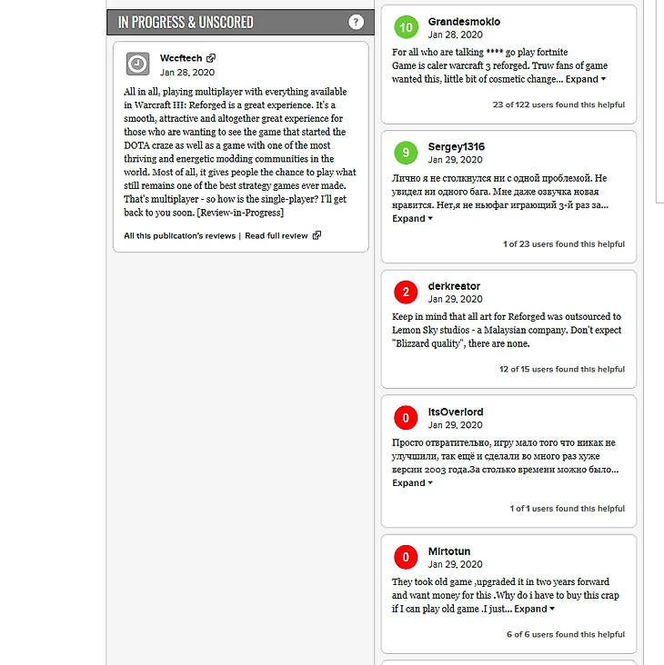 На крупнейшем агрегаторе рецензий Metacritic пользовательская оценка Warcraft 3: Reforged опустилась уже до 2 баллов из 10 – проголосовало почти полтысячи пользователей, многие развернуто уничтожили игру в отзывах. Положительные рецензии, конечно, тоже есть – но их активно дизлайкают.