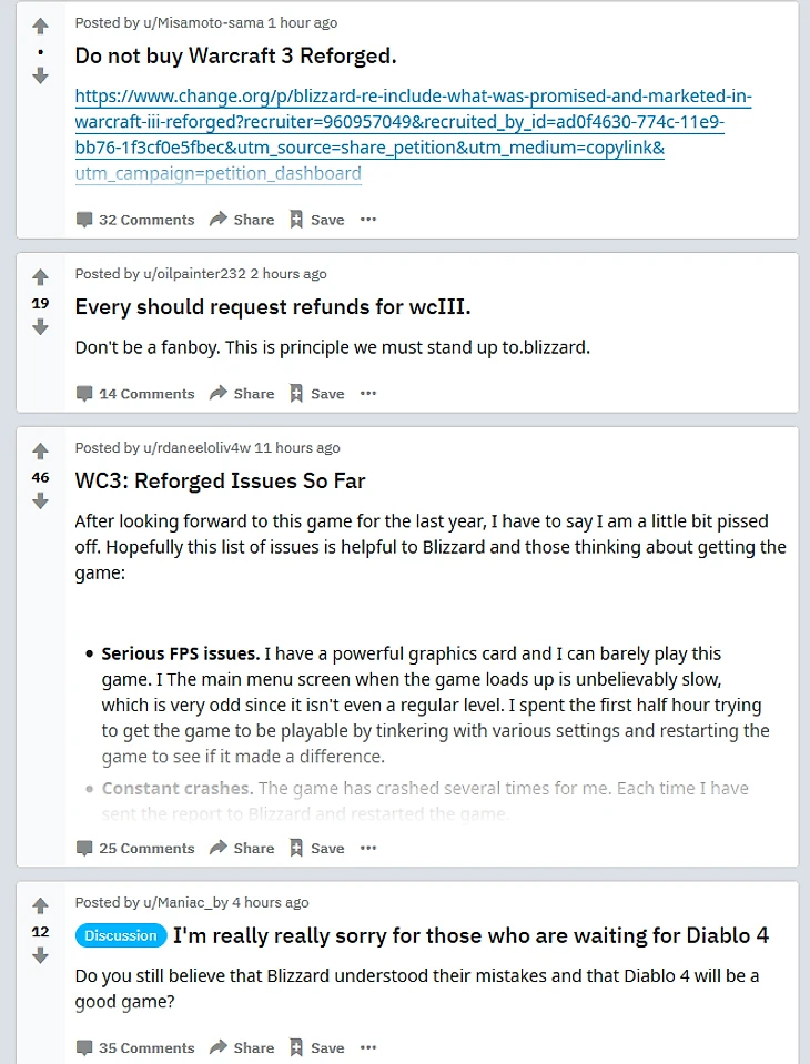 На связанных с Blizzard сабреддитах и официальном форуме компании сейчас страшно. Игрок создают треды с жалобами на сырой релиз, кто-то собирает список всех известных проблем, другие убеждают никого не покупать Reforged – хватает и петиций, требующих срочно привести игру в порядок и выполнить многочисленные обещания.