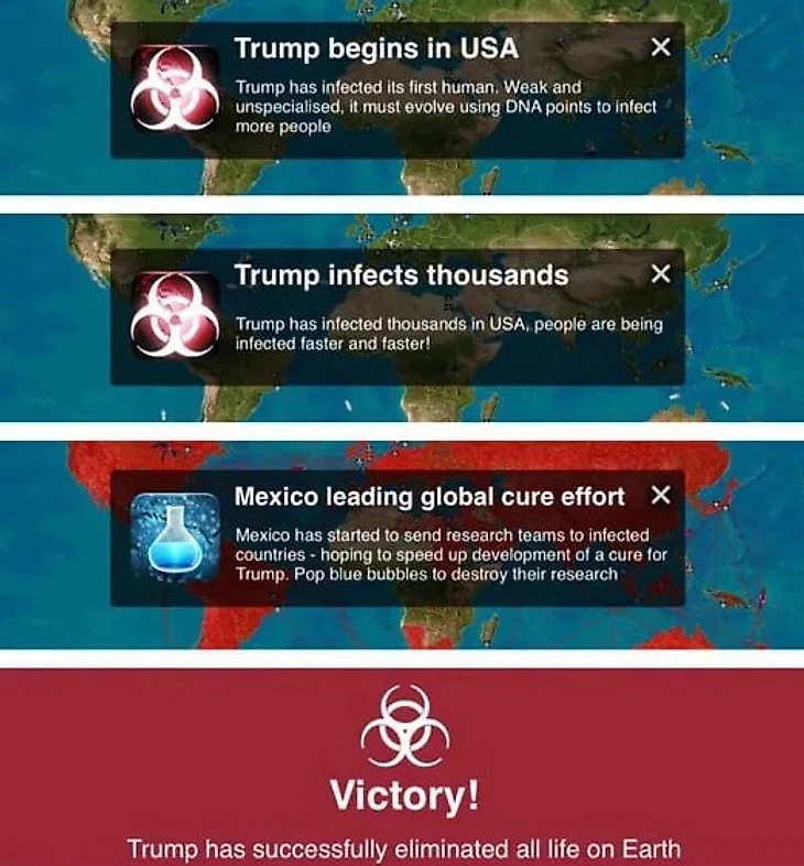 В 2016 году самым трендовым названием вируса было «Трамп». В этом сценарии вакцину от него искали мексиканцы, но в итоге миг погиб: