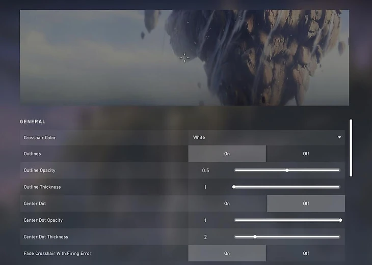 Важнейшая настройка в «Валорант» связана с этим элементом интерфейса. Игрок может выбрать не только цвет и вид курсора, но еще и настроить его отдельные элементы, включая их прозрачность и толщину.