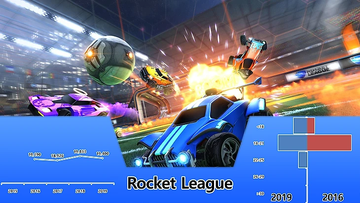 Обобщая, Rocket League стабильно последние 4 года держится на максимально детской аудитории киберспортсменов. Здесь имеются огромные значения по числу несовершеннолетних спортсменов, а игроков старше даже 21 года крайне мало.