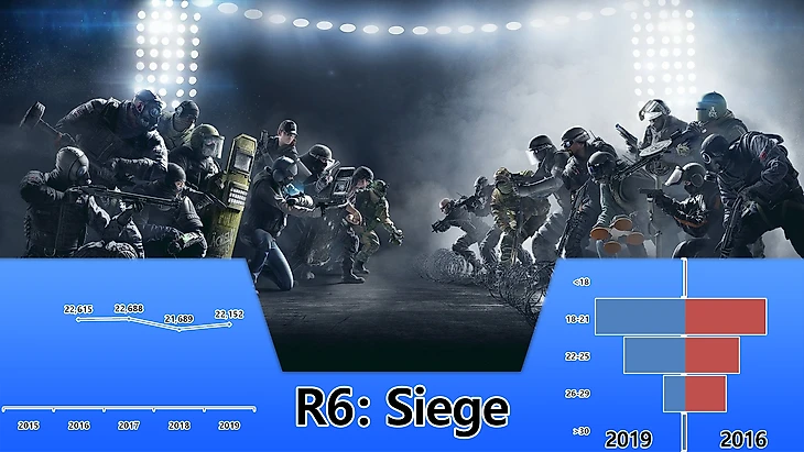 В такой относительно новой киберспортивной дисциплине как Rainbow Six: Siege можно заметить интересную и нетипичную для новых игр картину. Обычно в первые года новые игры имеют более старую аудиторию, которая перетекла из других проектов, но здесь уже с первых лет основная аудитория игроков была в возрасте от 18 до 21 года. Да было и множество игроков вплоть до 29 лет, но всё равно 46% приходилось на юных игроков. И к 2019 году, что в принципе ожидалось, новых и молодых игроков стало ещё больше и теперь более половины игроков до 21 года. Но при этом выросла и группа до 25 (скорее всего в неё перешли молодые игроки из 2016 года), и даже появились игроки за 30 лет. По графику среднего возраста также мы видим тренд на постепенное омоложение игроков, но это движение не сильно велико и средний возраст хоть и упал, но достаточно незначительно. Всего на полгода.