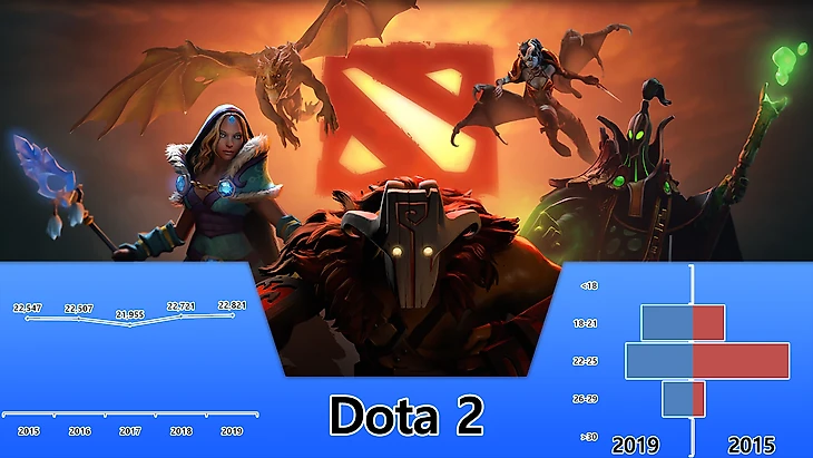 Далее у нас в списке идёт ещё одна игра от Valve. И у Доты можно заметить как схожие, так и отличающиеся детали. На первый взгляд кажется, что возраст также довольно стабилен и колеблется в рамках 22 лет, но если приглядеться, то видно, что до 2017 года средний возраст уменьшался, а после 2019 начал расти. С чем это может быть связано. По нашему мнению Дота сейчас испытывает не лучшие времена и до 2017 года в дисциплину приходило много новых игроков, которые и снижали средний возраст, но в последние года таких людей стало меньше и в связи с этим средний возраст начал расти. Также интересно и взглянуть на данные по возрастным группам. В 2015 году 65% игроков было в группе 22-25, а затем пять лет спустя распределение стало более ровным. Стало меньше игроков в 22-25, но зато значительно выросло число игроков с 18 до 21 года. Можно также заметить, что в сегменте 26-29 рост есть, но он не настолько велик, хотя казалось бы, после 5 лет как раз таки доминировавшая в 2015 группа 22-25 лет стала бы как раз этой группой 26-29 лет, но лишь некоторым «старичкам» удалось удержаться на высоком уровне.