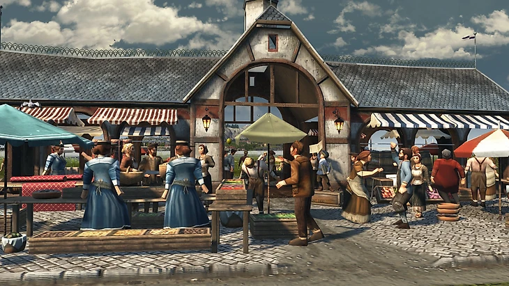 Только зацените это внимание к деталям: разная одежда, на столе стоят кружки и выпивка, вокруг даже есть трава и цветы. Рынок тоже хорошо детализирован, но ровно настолько, чтобы не загружать ваш комп. Женщина справа то ли танцует, то ли ругается, а сзади нее мальчик продает газеты.
