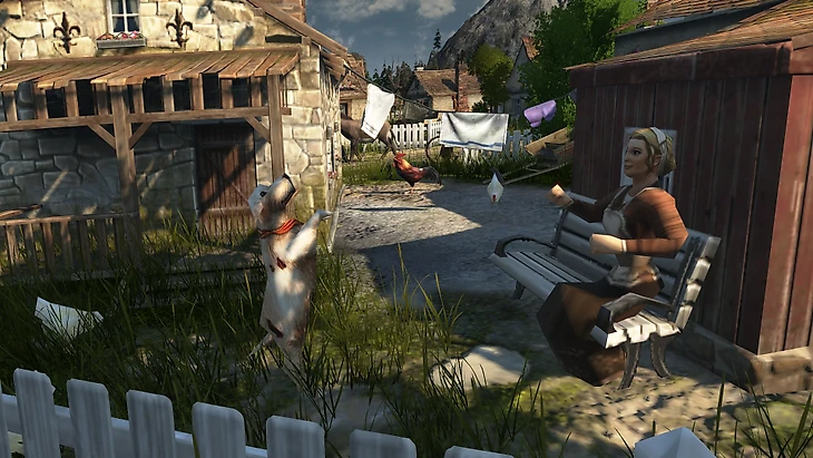 Еще одна крестьянка играет с собачкой, пока сохнет белье. Вокруг бегают лоу-поли курицы.