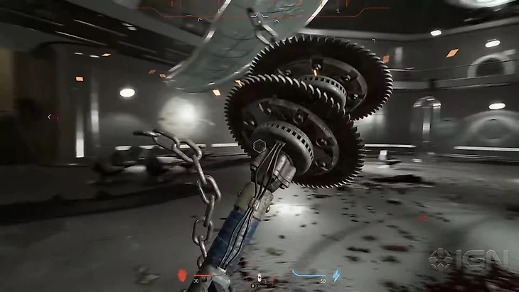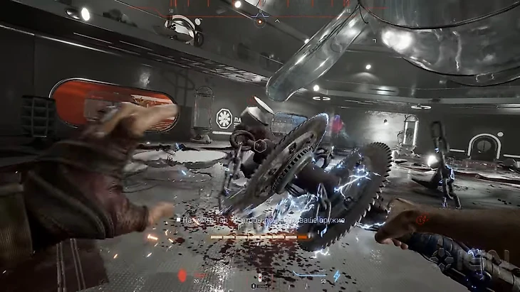 Так выглядит оружие ближнего боя, состоящее из двух дисков для циркулярной пилы. Прямо во время боя его можно чинить – но враг не будет мирно ждать вас в сторонке. Круто выглядящую пушку, которую показывают на первых минутах трейлера, Нечаев не использовал.