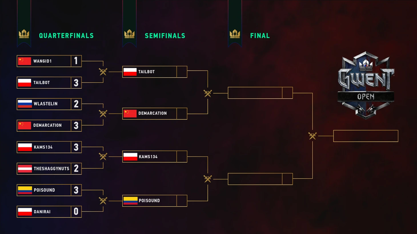 Третий Gwent Open изобилует как опытными игроками (TailBot, wangid1, Demarcation), так и полными новичками. Здесь в первую очередь стоит выделить Wlastelin из России, впервые отбирающегося на официальный турнир, и Poisound, проживающего в Германии, однако представляющего крайне экзотическую для Гвинта страну – Колумбию. Испаноязычная аудитория Гвинта не так велика, но она имеет отдельных мощных игроков, которые лишь по случайности обходили турниры стороной.