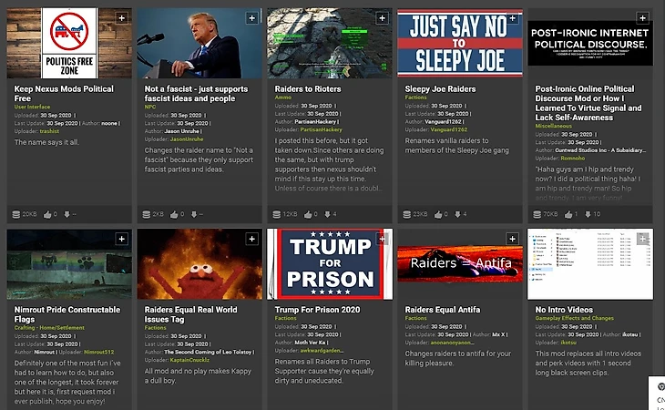 В сентябре на портал с модификациями для игр Nexus Mods были совершены массовые наплывы сторонников Трампа и Байдена. На сайт стало поступать так много различных модов с прямой поддержкой одного из кандидатов, что администрация Nexus запретила любые моды на политическую тематику до 20 января 2021 года.
