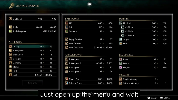 Ключевой момент видео – на 8:58, когда ютубер начинает фармить для выпадения золотой монеты. Ему потребовалось более пяти попыток. На 9:42 он пришел к Деве в черном, использовал монету и подождал в меню, пока набиралось огромное значение Удачи, увеличив значение урона меча голубой крови до заоблачных цифр.