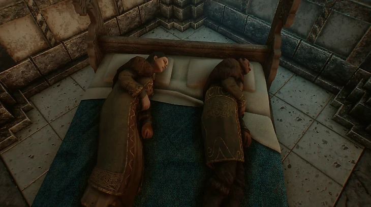 Но пока до свадьбы далеко, Виттория и ее жених Асгейр Снегоход живут в разных домах. Если вы проберетесь в особняк Виттории, то найдете там ее друга, управителя или еще кого-то близкого – Аквилия Эресия. Они настолько близки, что спят в одной кровати. Сам Асгейр тоже не особо верен будущей жене – когда вы подойдете к нему поговорить, играя за Довакина-девушку, он похвалит вашу красоту и скажет, что уже знает, с кем будет изменять жене.