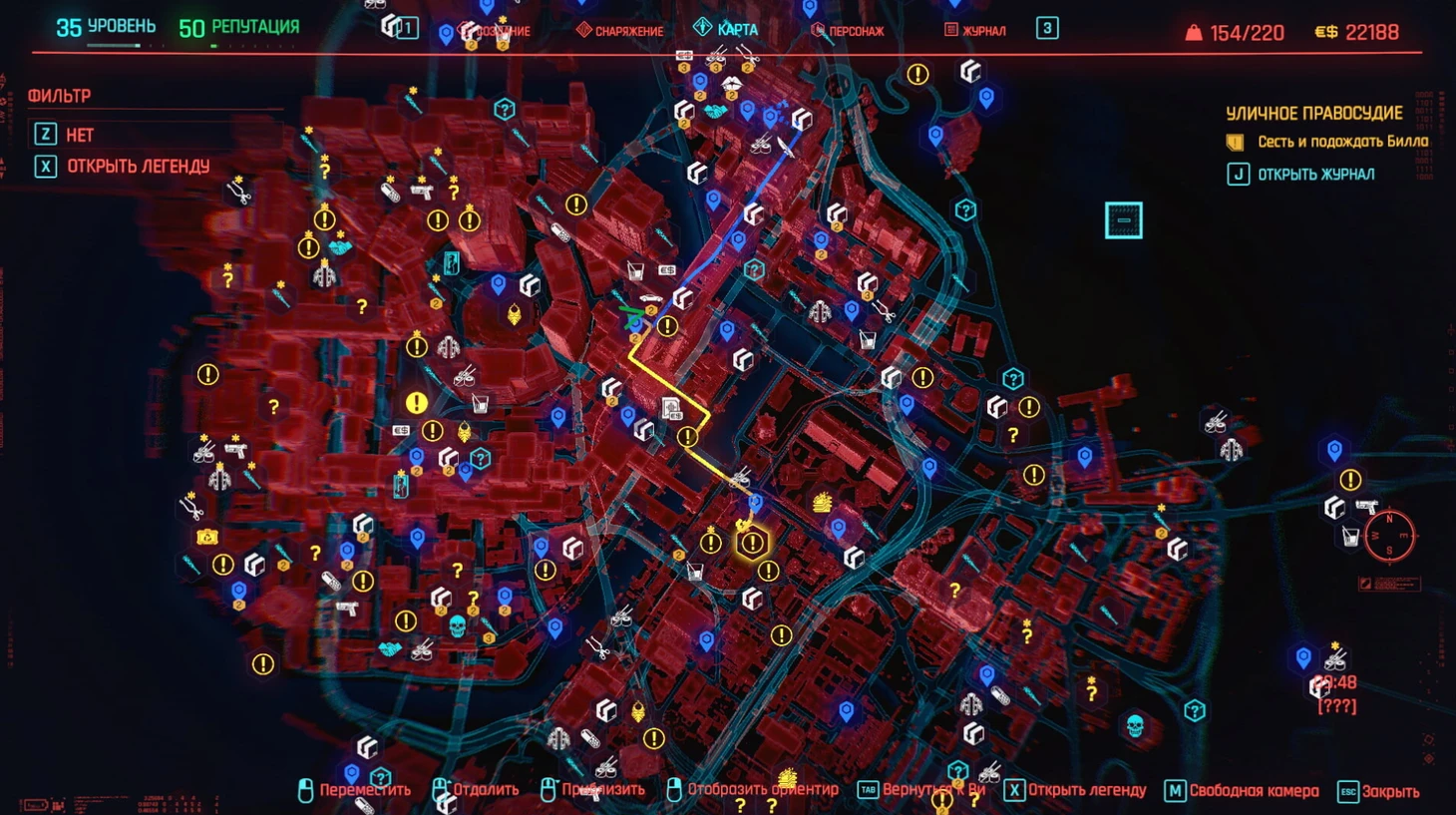 Сторонних квестов очень много – мир всегда отсыпет вам дополнительные квесты, если вы просто идете от одной точки задания к другой. Для сравнения, в «Ведьмак 3», когда вы пробегали напрямую через лес или поляну к следующему заданию, вы видели неподалеку знаки вопроса и отвлекались на них – подобная система работает и в Cyberpunk 2077. CDPR пообещала, что повторения ситуации с точками на Скеллиге не будет – там нужно сильно постараться, чтобы открыть все.