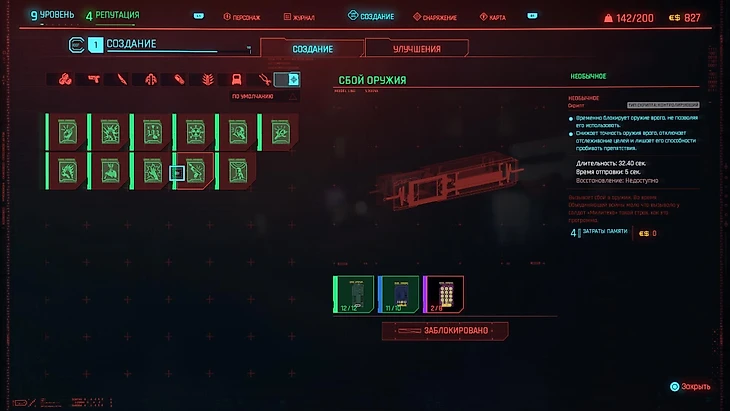 Один из вариантов получения скриптов – крафт. Переходим в меню создания, выбираем один из чертежей для скриптов, собираем нужное количество ресурсов и жмем «создать», после чего скрипт можно будет поставить в соответствующую ячейку импланта. Ресурсы добываются из заначек в локациях, при разборе скриптов и так далее.