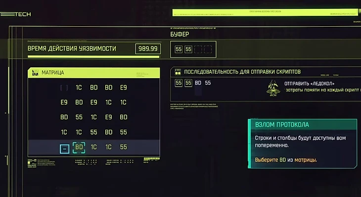 Так называется мини-игра в отдельном окне. Ее правила довольно просты: за отведенное время нужно выбрать нужные комбинации цифр и символов в порядке, указанном в правой части окна. При этом вы начинаете с верхней строчки, второй кусок кода выбираете из столбца, в котором находился первый кусок выбранного кода, третий – из строчки, в которой находился второй выбранного кода и так далее. Обратный отсчет начнется только после выбора первого куска кода, так что стоит заранее продумать последовательность, которую вы будете набирать. Просто держите в голове это простое правило чередования строк и столбцов и мысленно прикиньте порядок действий.