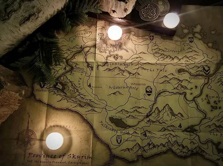 Bethesda поздравила фанатов серии The Elder Scrolls в твиттере с Новым годом: «Запишите прошлое и нанесите на карту будущее». На картинке изображена карта Скайрима с границами ближайших стран, монеты из TES Online, зелень и свечки.