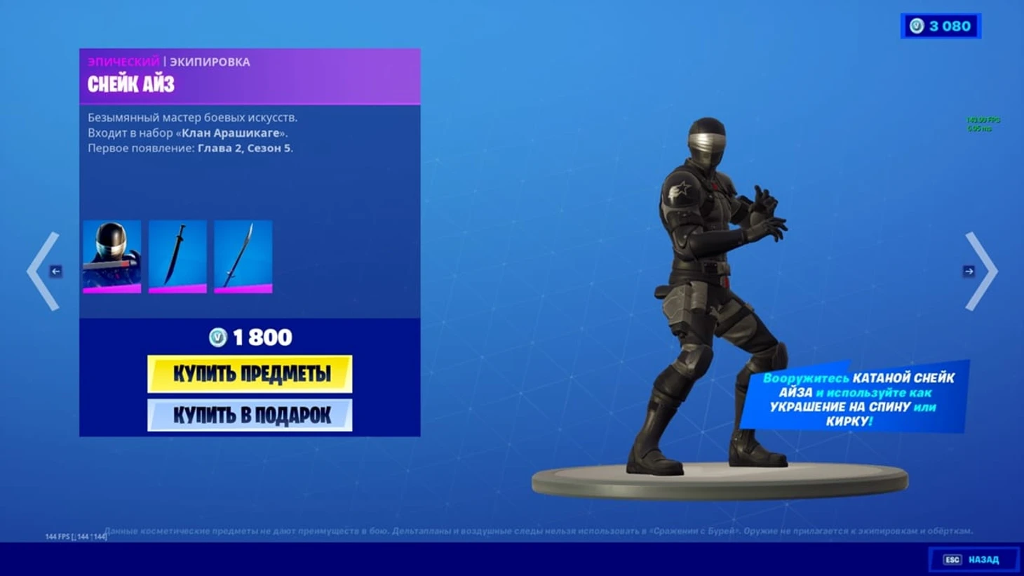 Скин «Снейк Айз» уже появился в магазине фортнайт и стоит 1800 В-баксов.
