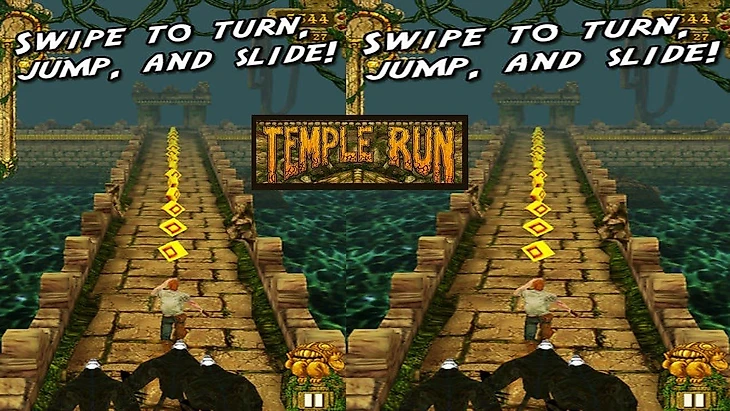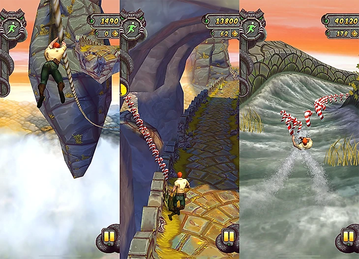 Настоящий хит вышел в 2011 году – первый Temple Run. Это простой бесконечный раннер, в котором игрок управляет безымянным исследователем. По сюжету ему нужно сбежать от злой обезьяны, которую он потревожил в храме. Для управления используется сенсорный экран и акселерометр в телефоне/планшете. По бокам дорожки, по которой бежит герой, иногда появляются монетки, и чтобы их собрать, нужно наклонить телефон влево или вправо. В начале игры монеты только золотые, но по мере набора очков попадаются красные и синие, более ценные.
