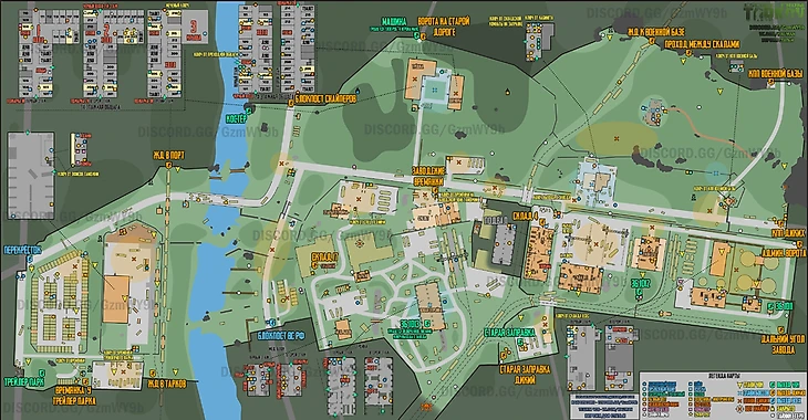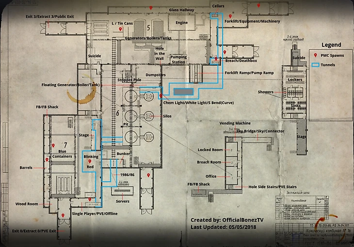 Схематическая карта Завода с выходами, местами спана игроков и лута