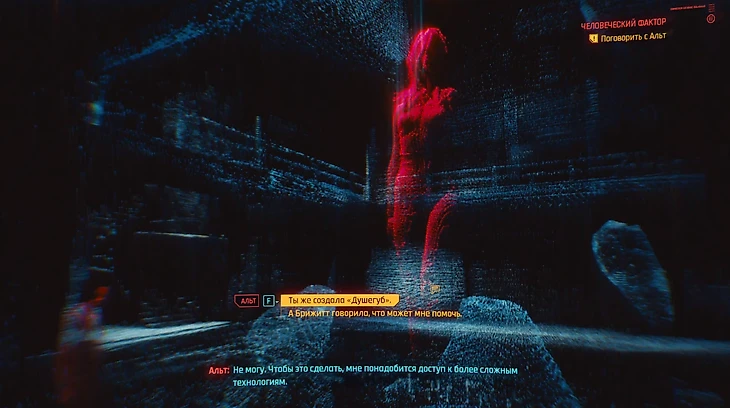 После сцены с воспоминаниями Ви придет в себя и поговорит с Альт. Она отключила «вудуистов» для вашей с Джонни безопасности. В основном, говорить будет Джонни, а вы можете выбирать второстепенные реплики, чтобы побольше узнать об их прошлом.