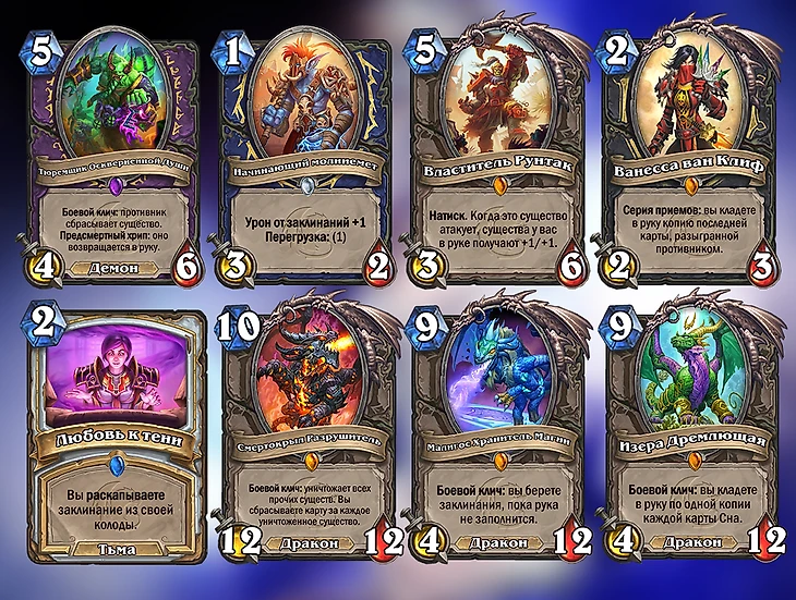 Полностью новых карт будет 29. Вот некоторые из них, в том числе, переработанные драконы: Изера, Смертокрыл и Малигос. Вместо Эдвина ван Клифа, уходящего в вольный режим, появится его дочь Ванесса.