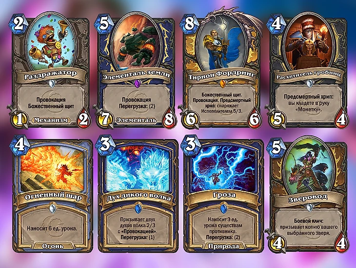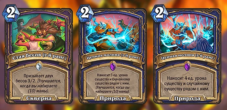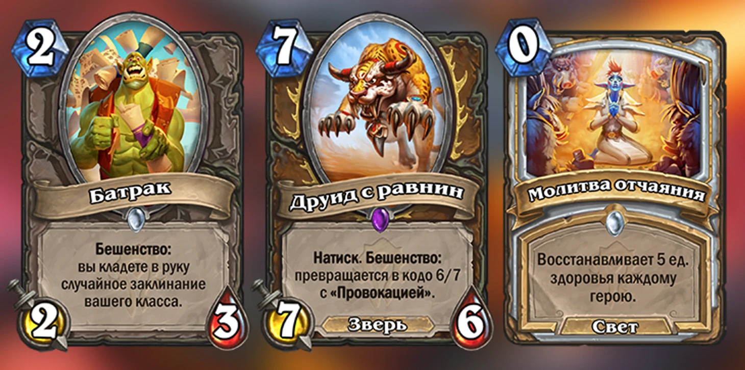 Заметили, что на заклинаниях появились новые ключевые слова? Каждое заклинание получит подобную метку. Всего их 7: «Тайная магия» (эту метку получат 2 карты из «Закаленных степями», а также 44 из предыдущих дополнений), «Огонь» (2 и 43 заклинания), «Лед» (2 и 24 заклинания), «Скверна» (3 и 22 заклинания), «Природа» (6 и 112 заклинаний), «Свет» (5 и 67 заклинаний) и «Тьма» (4 и 109 заклинаний). Например, легендарка шамана Бур’кан увеличивает урон только от заклинаний природы, а «Огненному шару» дополнительного урона не даст.