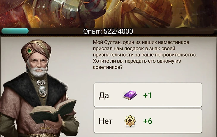 Проще всего объяснить работу системы решений, поэтому начну я с нее. Никаких выборов того, кто из наложниц будет воспитывать наследника, оскорблений из-за лишнего веса или драк за честь своей дочери здесь нет – вы просто раз в 20-30 минут выбираете либо ресурс, либо книгу опыта для советника, либо опыт для своего султана.