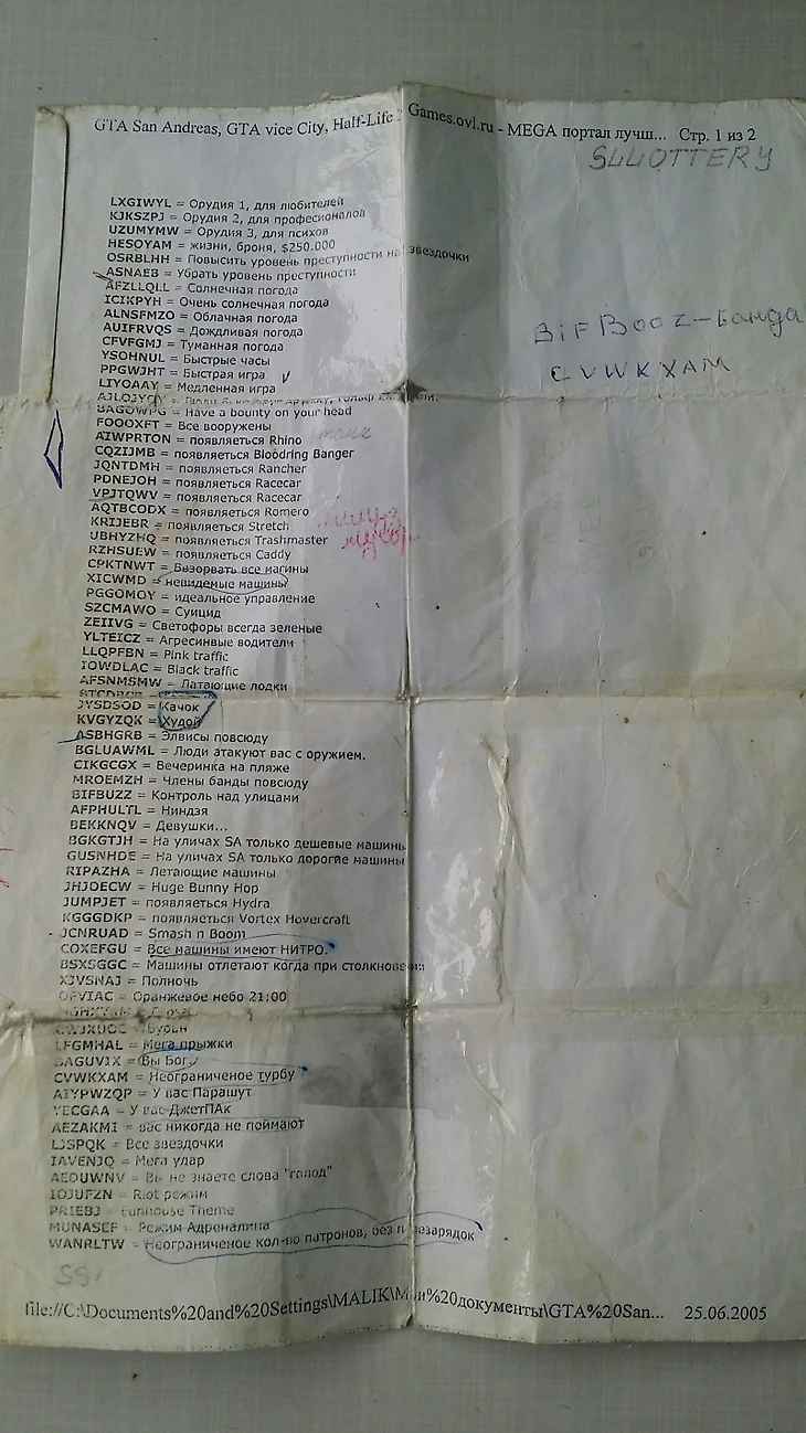 Иногда в играх были коды уровней, которые приходилось записывать (или запоминать), чтобы не потерять прогресс. Кроме этого, существовали записки с читами, которые переписывали друг у друга (или перепечатывали, если вам около 25 лет). Запомнить все комбинации рандомных символов было сложно. Пикабушник Arheemet поделился фоткой обязательного атрибута каждого игрока в GTA: SA – листка с читами.