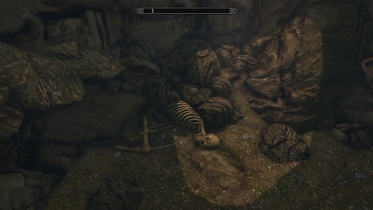 В шахте есть водопад, куда не так просто попасть. Проще всего сделать это с помощью крика «Стремительный рывок». Мы увидим, что Берн так и не сдался – он нашел целых три жилы с золотой рудой, но его завалило камнями. Хадрир зря обвинял его, потому что золото все-таки нашлось, а сам Берн никуда не сбегал. Только мертвому золото уже не нужно, а вот Довакину точно пригодится.