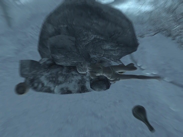Вероятнее всего, вы хотя бы раз попадали под дубину великана. Один удар подкидывает любого врага (не считая драконов) в воздух, и соперник умирает. Похоже, что этот мужчина на камне неудачно прогулялся по территории великанов и разозлил их – поэтому его тело упало так далеко. Может быть, он бы выжил, если бы приземлился не прямо на камень, а в воду неподалеку.