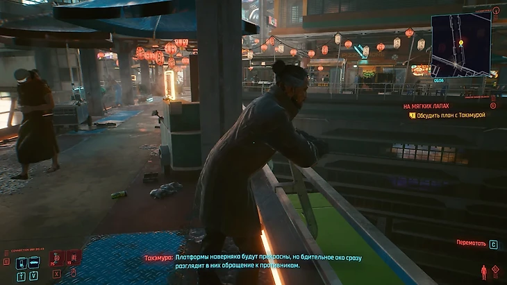 Через день после выполнения миссии «Старые друзья» Такэмура позвонит Ви и предложит встретиться в Джапан-тауне. Если вы заблудились, воспользуйтесь лифтом – встреча произойдет на мосту высоко над районом. Выслушайте его план – он хочет, чтобы Ви обеспечил(а) безопасность, а он запрыгнул на платформу к Ханако Арасаке и рассказал ей правду о смерти отца.