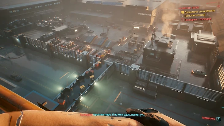 Неподалеку от входа стоит небольшой грузовик. Можно въехать на территорию в нем, если у вас прокачана Техника для угона. Если выбрана предыстория корпората, то водитель согласится отдать грузовик Ви. В любом случае, можно проникнуть внутрь бесшумно.