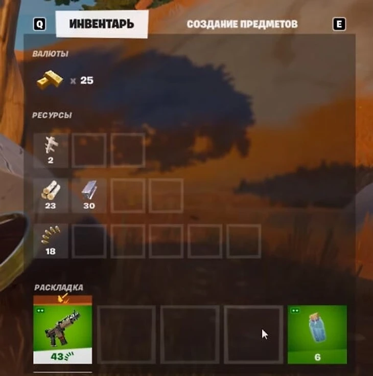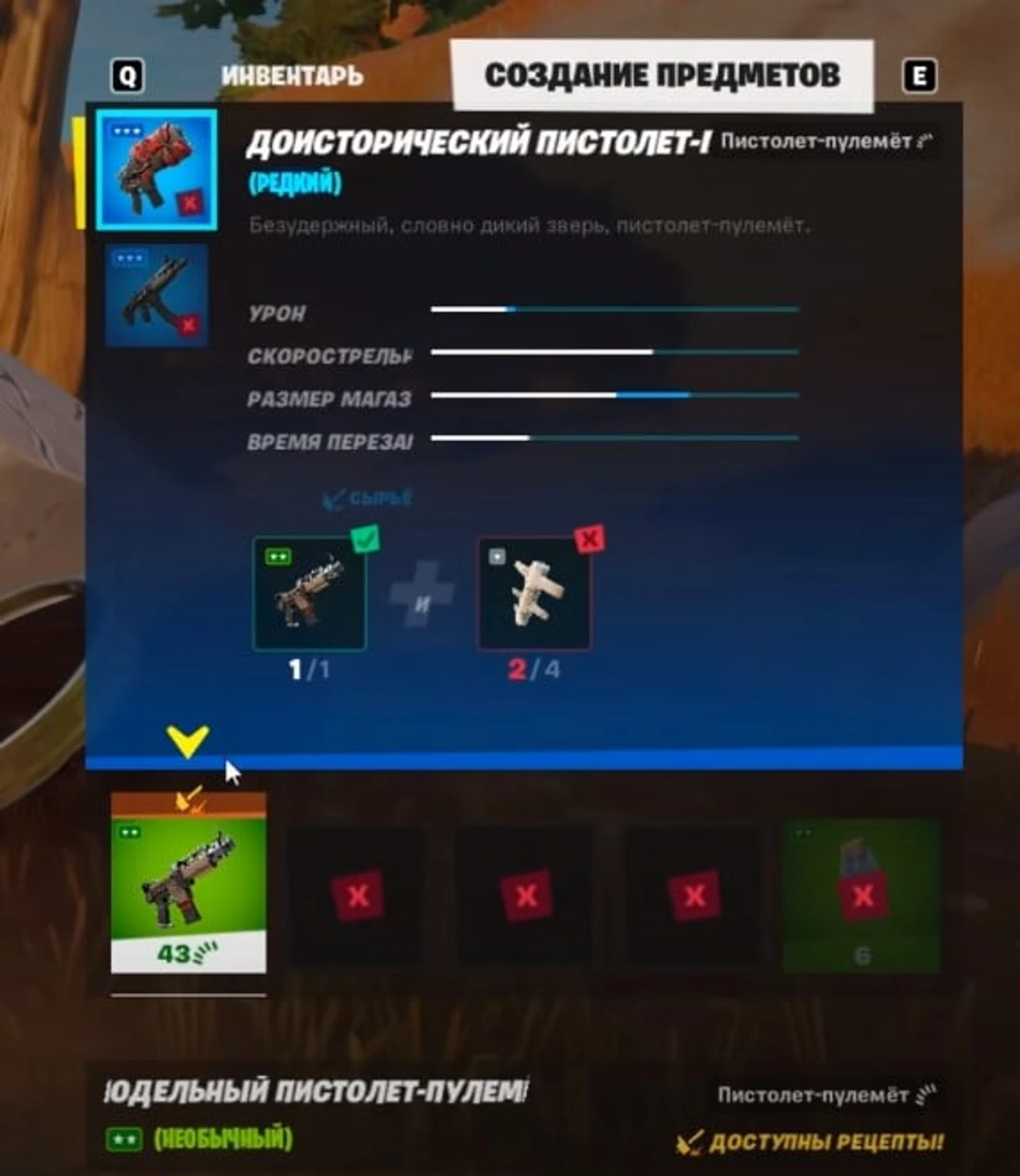 Для начала крафта в Fortnite найдите любое оружие и нажмите кнопку инвентаря. Как видите, здесь появилась новая вкладка «создание предметов». Здесь вам покажут доступные рецепты для крафта.