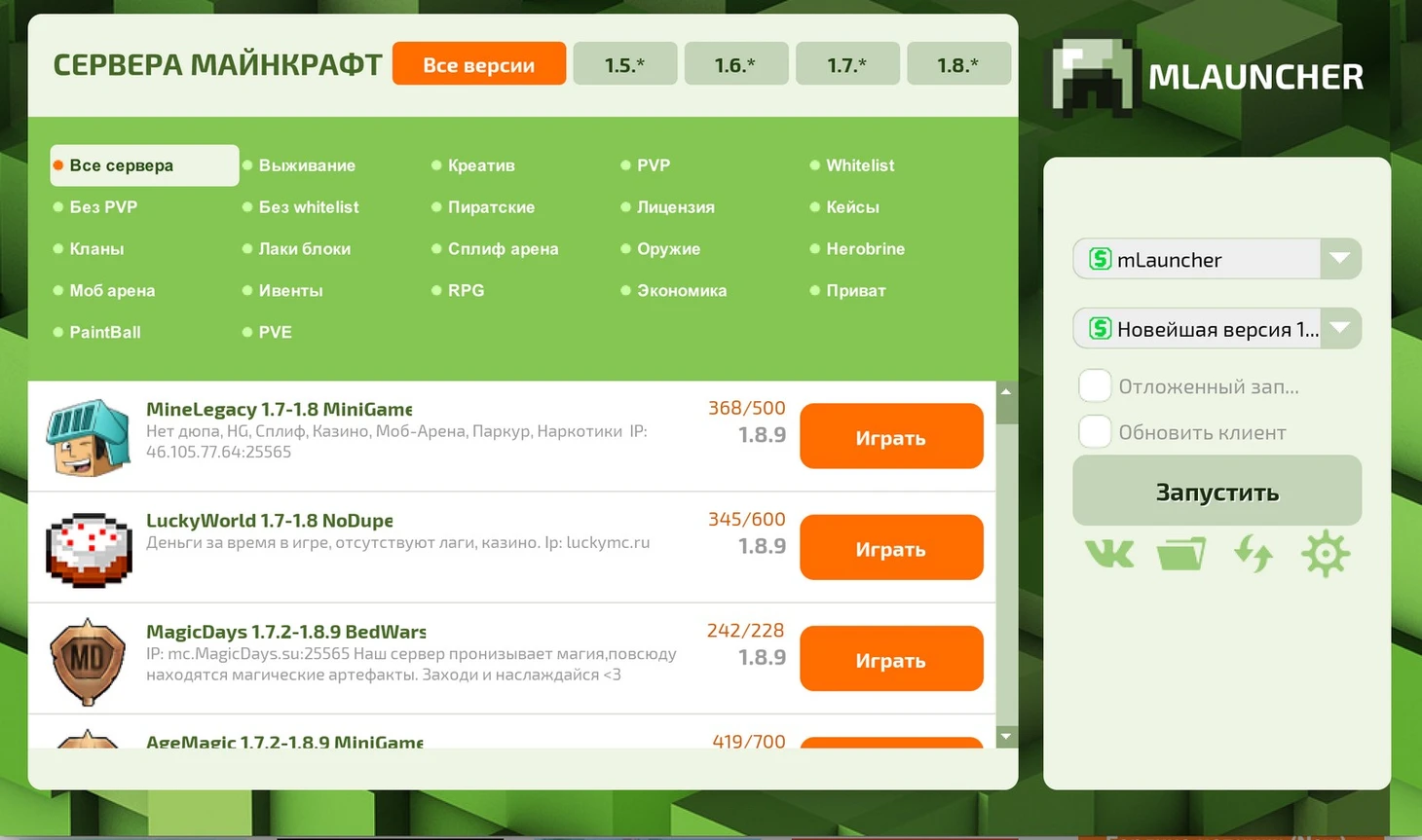 MLauncher отлично подойдет для сетевой игры. Здесь присутствует система создания скинов, а также мониторинга серверов в режиме реального времени. Благодаря этому лаунчеру, можно с легкостью выбрать желаемый тип сервера, на котором хотите играть, а также необходимую версию игры.