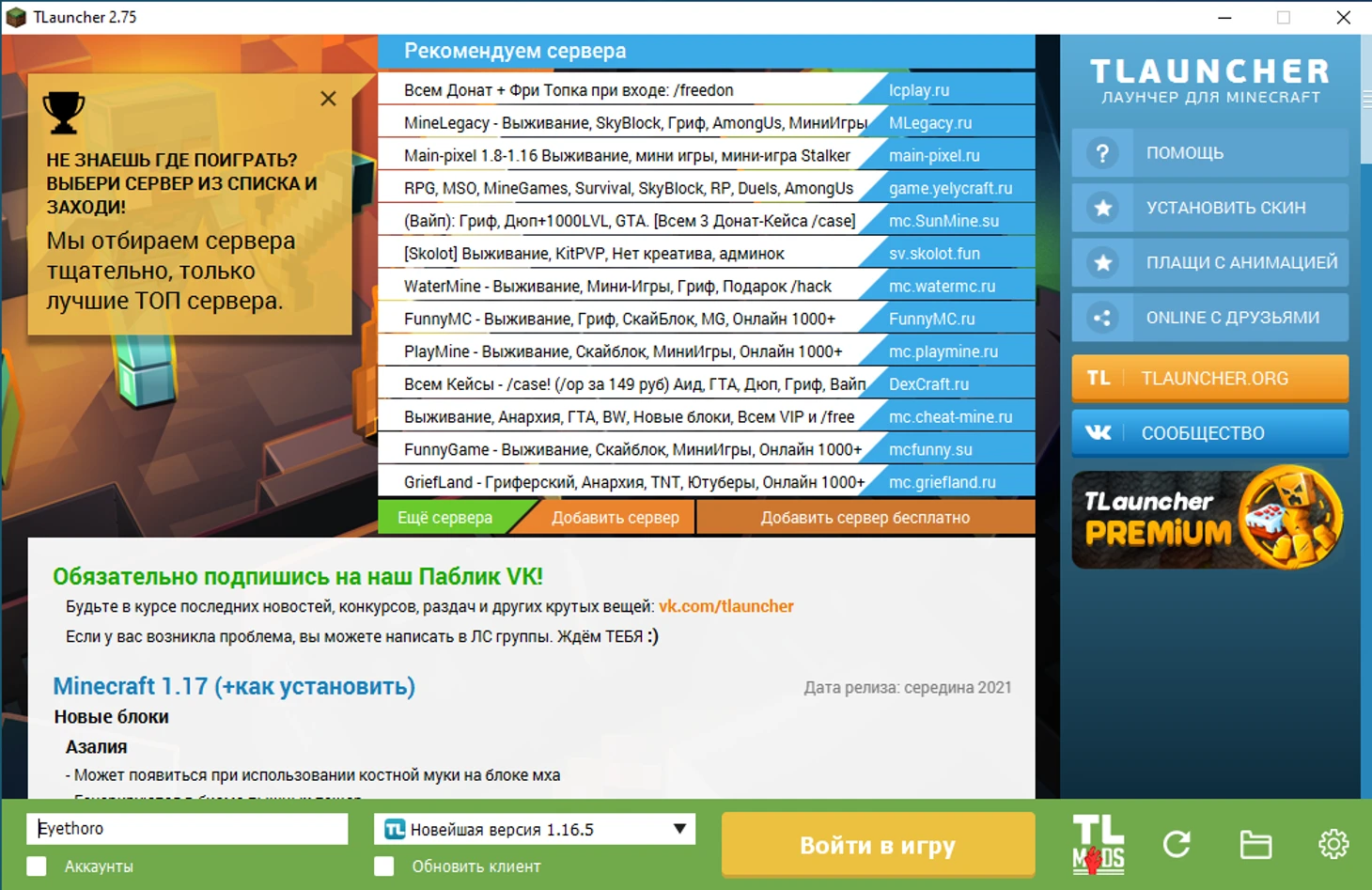 TLauncher является самым популярным лаунчером Minecraft. В нем доступна как одиночная игра, так и игра на различных серверах. Также здесь присутствует возможность установки модифицированной версии, что позволит устанавливать моды без всяких проблем и ошибок.