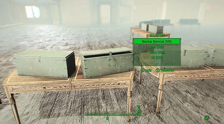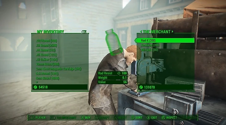 Ну и куда же без нее! В Fallout 4 она сделана максимально аутентично – здесь находятся все вещи из игры. Отдельно отсортированы ящики с оружием, броней, используемыми предметами, хламом и т.д., а еще здесь зачем-то стоит торговец с тремя предметами на продажу – стимпаками, рад-X и антирадином.