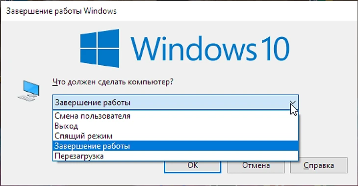 В открывшемся диалоговом окне выберите нужную опцию: через это сочетание клавиш можно не только выключить ПК, но и сменить пользователя, выйти, перевести компьютер в спящий режим или перезагрузить его.