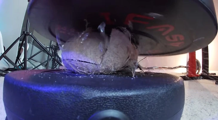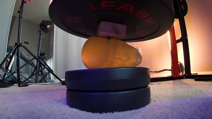 Еще до эксперимента Кайл оценил, что шаг Димитреску одной ногой в туфлях на шпильке оказывает давление в 145 миллионов Паскалей. Ютубер сразу заверил, что это звучит фатально, так как плотная сталь, применяемая в строительстве, способна продавиться под давлением в 300 паскалей – человеку уж точно не поздоровится. Но он все же показал, что будет с головой.